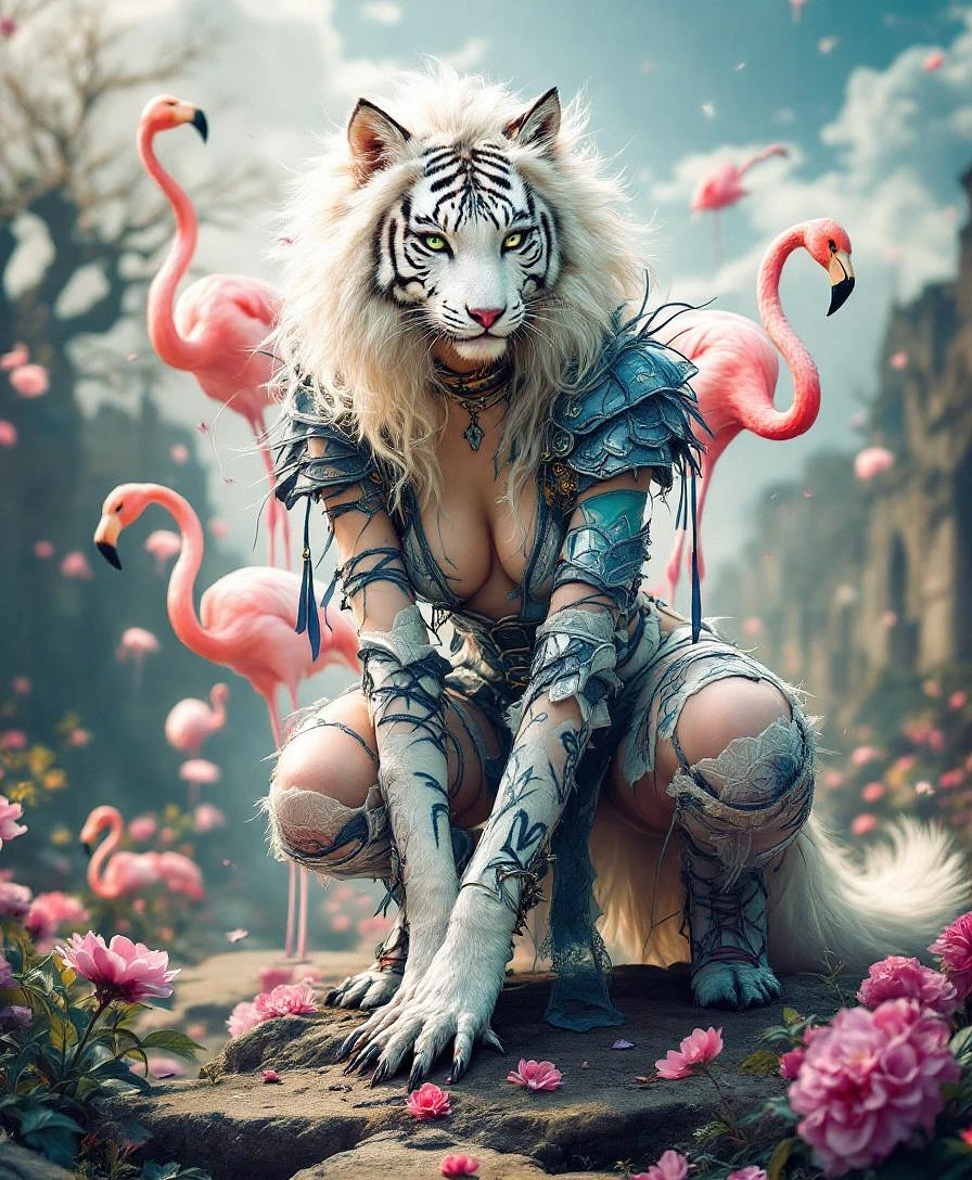Surreal cosmic ephemeral fantasy, Alice in wonderland surreal psychotropic, mad hatter pink flamingo cheshire cat elements in background, Full-length. Vintage 1800 Haute couture fashion, Snow Tiger-Storm Wolf anthropomorphic bestial polymorphic hybrid, feminine form. Crouching, lunging dynamic action poses, multiple individual blended images, collage. Translucent washes and fluid brushstrokes create a surreal abstract 3D aesthetic. spring psychedelic fashion colors, haute couture street wear, dystopian tatted lace fashion, wearing Tres chic leather and lace Battle armor, front view back view side view, fun playful, creative surreal fantasy vouge fashion flair, multiple creative action battle poses, cheeky cute. fashion, medieval celestial, professional fashion, semi-realistic creative surrealism, warped fantastical elements fantasy models, knights, paladins, surreal Dark entities, overgrown dystopian Aztec crumbling deserted ruins background.