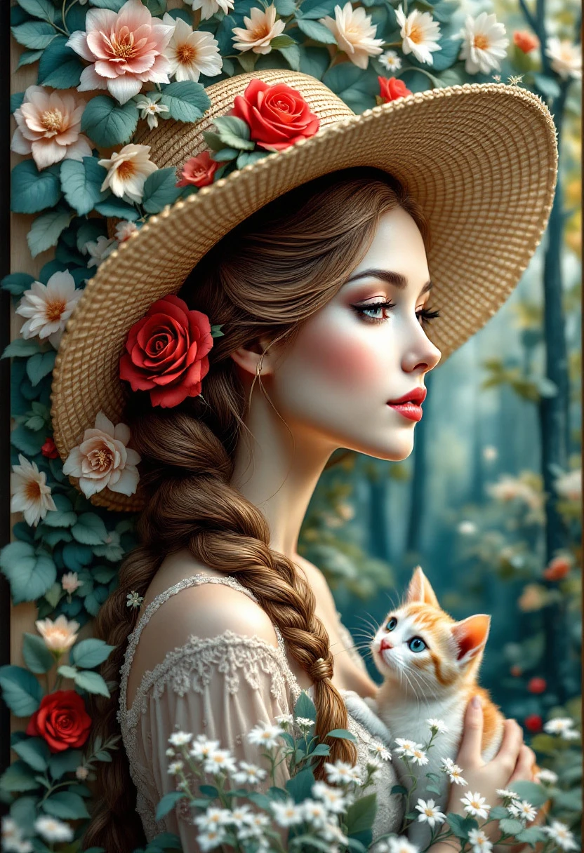3D art. Relief art. The image features a beautifully crafted wooden relief with a woman's face in profile, adorned with a wide-brimmed straw hat and stunning floral accents that exude elegance and artistry. She is sitting in the garden with her and her cat. The woman has long hair tied in a braid. The braid is adorned with a red rose. Her expressive eyes and gentle facial features stood out against a vibrant, dreamy background. A forest can be seen in the background. 4K.