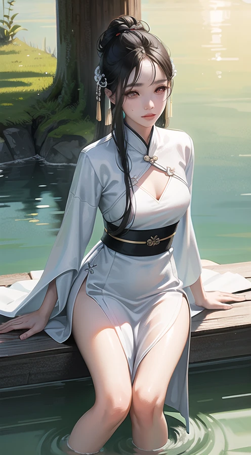 (Song dynasty) , ((white hanfu) ), full body visible:1. 1, wet white pantyhose:1. 3, (cute face) , (highly detailed face and eyes:1.2) , thick thighs:1. 6, glasses, masterpiece, best quality, 1 mature female, (sfw) , colored tips, smoky makeup, (perfect skin+face) , very detailed red eyes, (intricately detailed) , cute nose, artificial backlighting, highres, high contrast, hdr, skindentation, Sunset, Stone Bridge, Willow Tree, Small River, Jiangnan, China, Lean Horse, Street with Few People