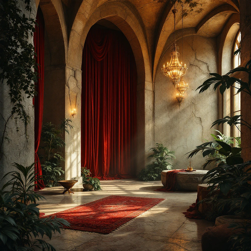 A surreal and luxurious moodscape merging raw brutality and sacred opulence. Cracked concrete walls, aged limestone textures, and rough stone reliefs meet lush red velvet, worn Persian textiles, deep forest foliage, and the dim shimmer of antique chandeliers. The space breathes through filtered golden light and heavy shadows, a misty canopy visible through glass ceilings. Rich ochre, blood red, charcoal, and ivory tones dominate. Abstract perspectives with no furniture — only walls, ceilings, natural textures, and atmosphere. A visual tension between earth and ritual, wild nature and faded grandeur, designed as a sensory background for a timeless, poetic website. Vibe: sacred, mysterious, powerful, tactile, cinematic