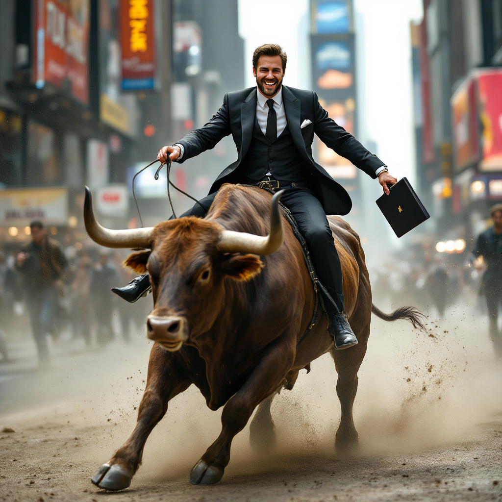 A man in a fancy suite, portrayed in stunning realism with intricate details, is riding a powerful bull in the lively streets of New York. His fancy black suit contrasts with the earthy tones of the city, now slightly dusty and worn from the excitement. The bull, muscular and determined, bucks and kicks with energy, while the man, gripping the reins with one hand, holds his laptop bag in the other, laughing joyfully.