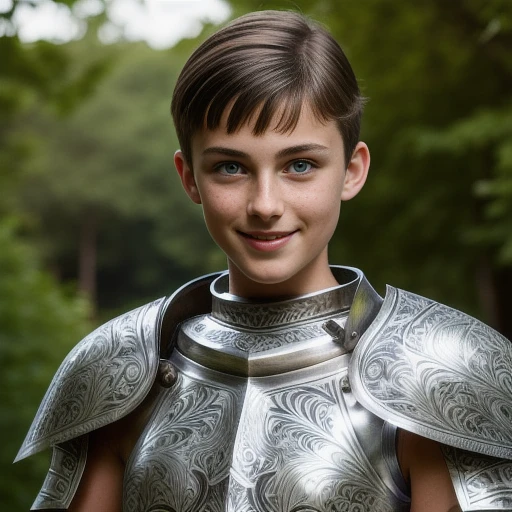 real photo, portrait of Beautiful 18 year old european girl with small waist, blue eye, cropped hair, brown hair, freckles, elegant, attractive, goddess, month close, kind, pretty, smiling, female, nice, highly detailed, bright open eyes, (((wearing highly detailed etched silver knight armor) )), decorative etching across surface (Masterful Digital Artwork:1. 3) of (Ultra detailed:1. 3) , (raw photo ((ultra-detailed) )), dark forest scene, angelic face ((ultra-detailed) ), ((photo) ), (messy short hair) , ((ultra-detailed) ), dark silver-blonde hair, green eye, bokeh, Hasselblad, Zeiss lens, F1. 4, god rays, volumetric fog, sun set behind trees, light dapples, army behind