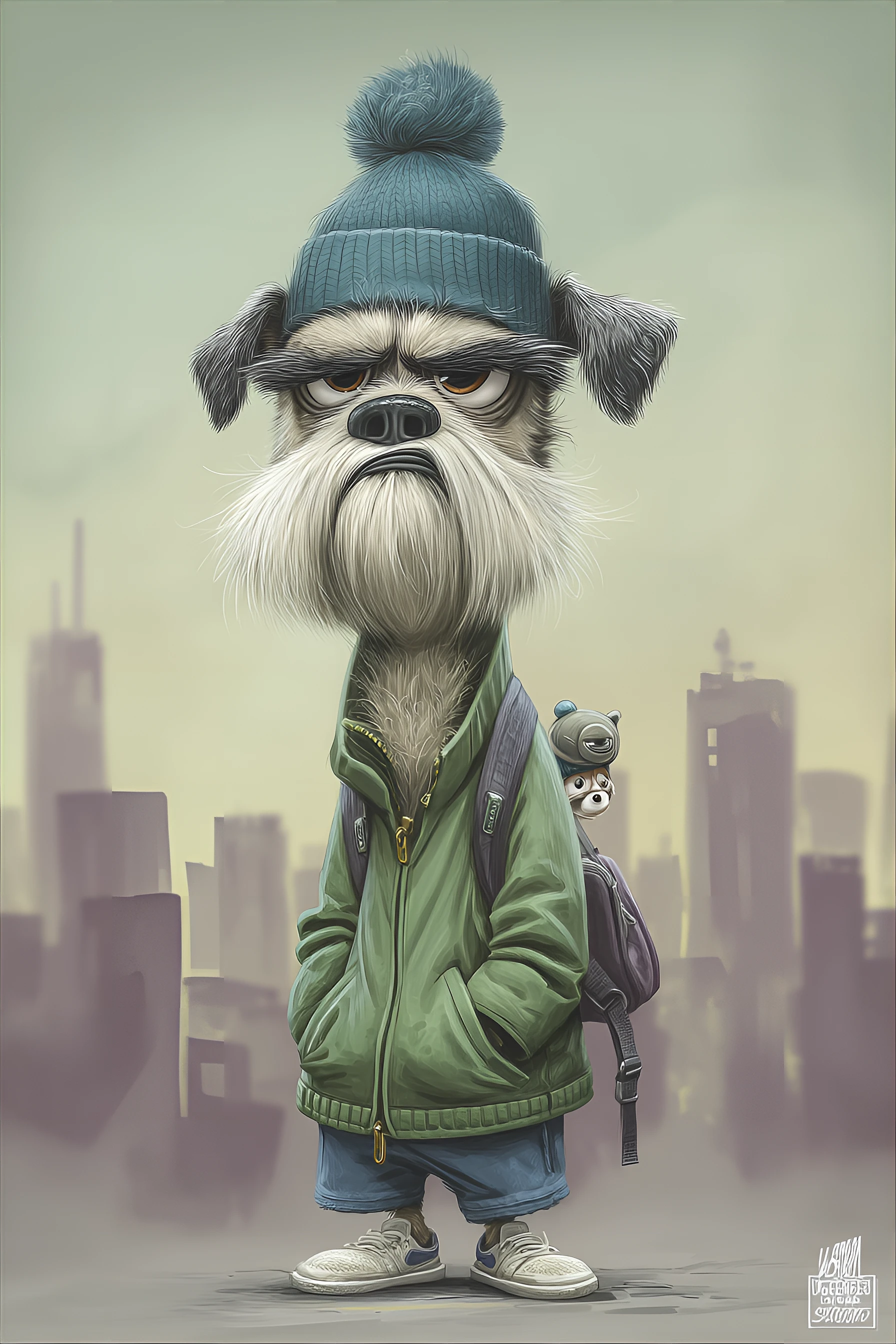 funny caricature, grumpy urban dog, male, 7 years old, scruffy, streetwise, annoyed, small dog with an oversized head, tiny body, and exaggerated facial features