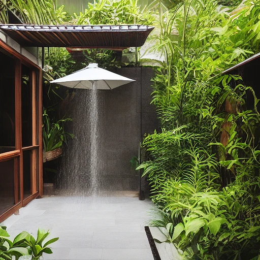 High resolution photography of modern enclosed lush balinese garden courtyard with outdoor shower small spa and dining area with smooth paving, a beautiful redhead is showering, magazine, cozy atmosphere; 8k, intricate detail, photorealistic, realistic light, wide angle, kinkfolk photography, A+D architecture