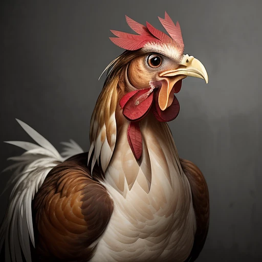 Generate an image featuring a scared chicken in a visually engaging and expressive manner. The chicken should exhibit signs of fear, such as widened eyes, raised feathers, and a tense posture. Capture the essence of the moment, conveying a sense of urgency and unease. Consider incorporating elements in the background that might have triggered the chicken's fear, adding context to the scene. Pay attention to details like feather ruffling and facial expressions to evoke a genuine sense of fright. Ensure the overall composition is visually compelling and tells a story of the startled chicken