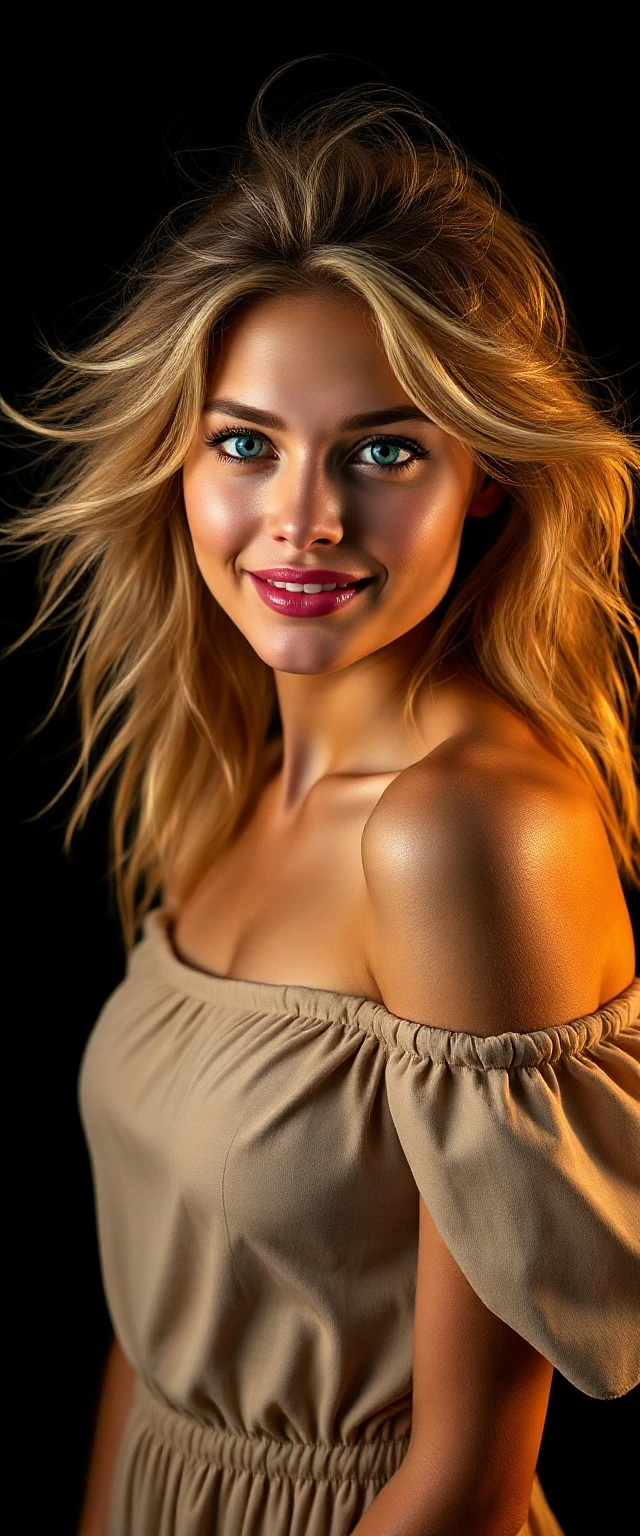 "Professional fine art photograph, full-body portrait. A supermodel in her early 20's with striking aqua-blue-silver-grey eyes and tousled windswept voluminous honey-blonde hair, full smiling pink lips. Wearing a light, neutral off-the-shoulder dress. The background is deep black. Warm, soft lighting, diffused shadows, subtle illumination. Dramatic cinematic style, vibrant colours. "