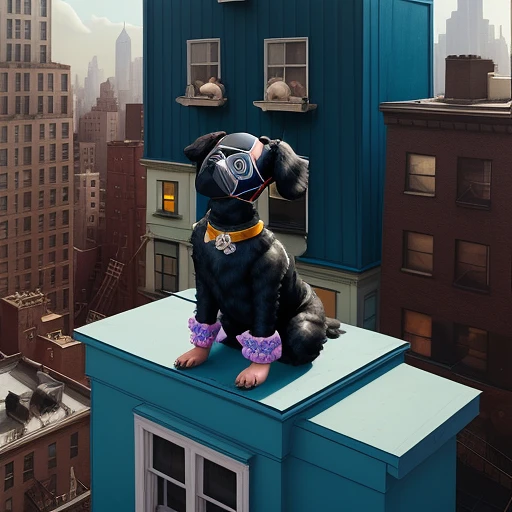 a realistic dog wearing a black face mask, sitting on top of a building looking down on a small blue house in new york by Miles Aldridge.
