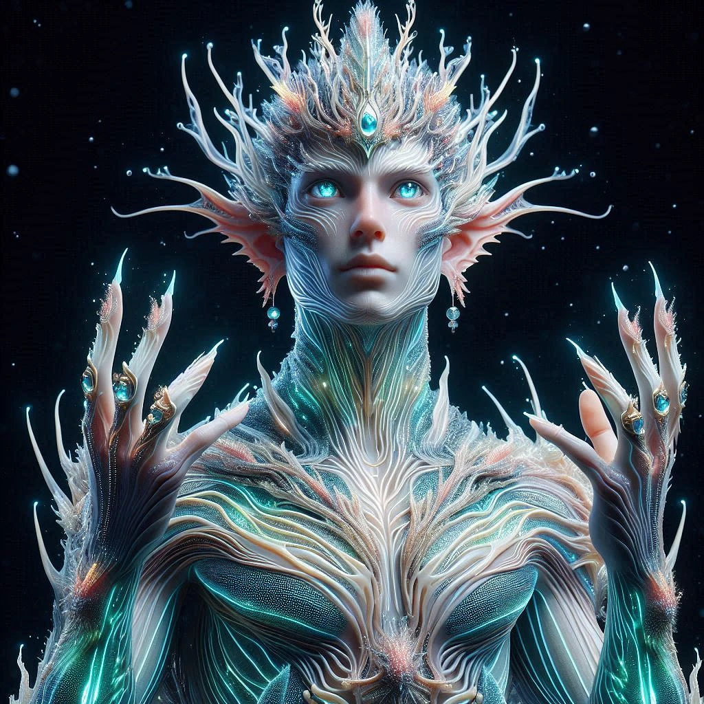 A hyper-realistic 3D character of an ancient ruler from a deep-sea civilization, his body a perfect blend of human and aquatic features. His skin is semi-translucent, revealing bioluminescent veins that pulse with soft, rhythmic light. His eyes are large, reflective, with a deep oceanic glow. He wears an ornate, coral-like crown and armor made from iridescent, living shells that shimmer with every movement. His hands extend into elegant, webbed fingers, and he carries a trident made of glowing, bioluminescent crystals. The background is a vast, mysterious underwater city, filled with glowing marine life, with every detail reflecting the serene beauty and alien grandeur of the deep ocean