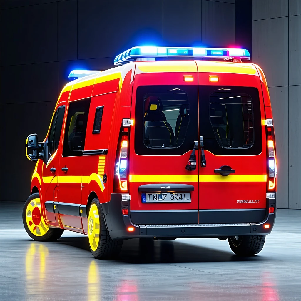 Future french ambulance, renault master e tech 2026, concept, red, yellow reflective stripes, full case at the rear for standing people, no van
