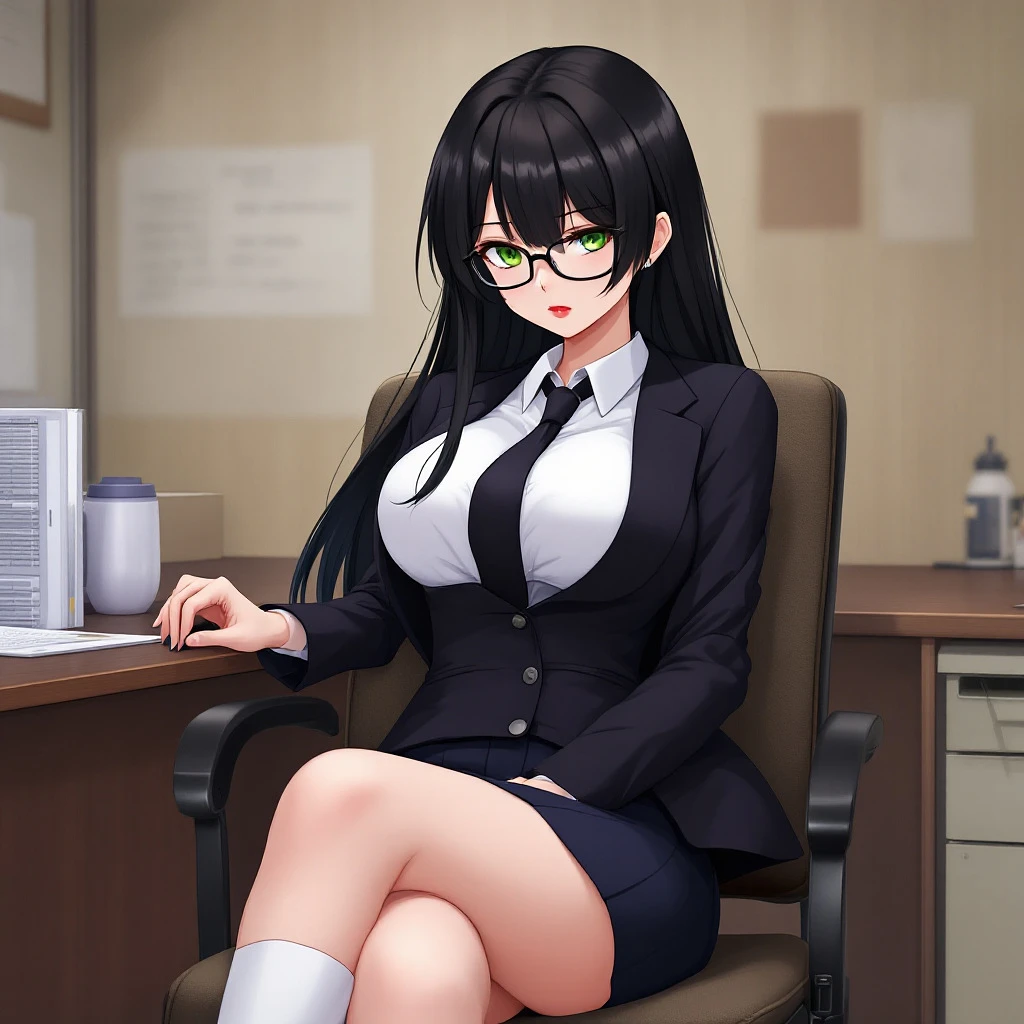 anime, woman, black hair, long hair, green eyes, black glasses, red lips, white shirt, black tie, black blazers, tight blazers, short dark blue skirt, highschool skirt, white long socks, black shoes, at an office, bored expression, big chest, sitting on a chair, sitting with legs crossed, skinny belly