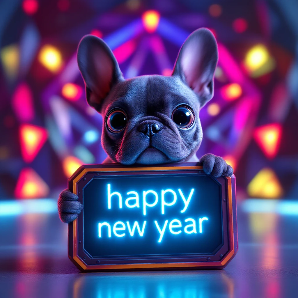 3d Image Pixar Style, Cute french bulldog puppy with huge eyes, holding a Flat lay mockup of [a futuristic metal sign] (with text "happy new year") , background with [strange geometric shapes and colors, glowing]