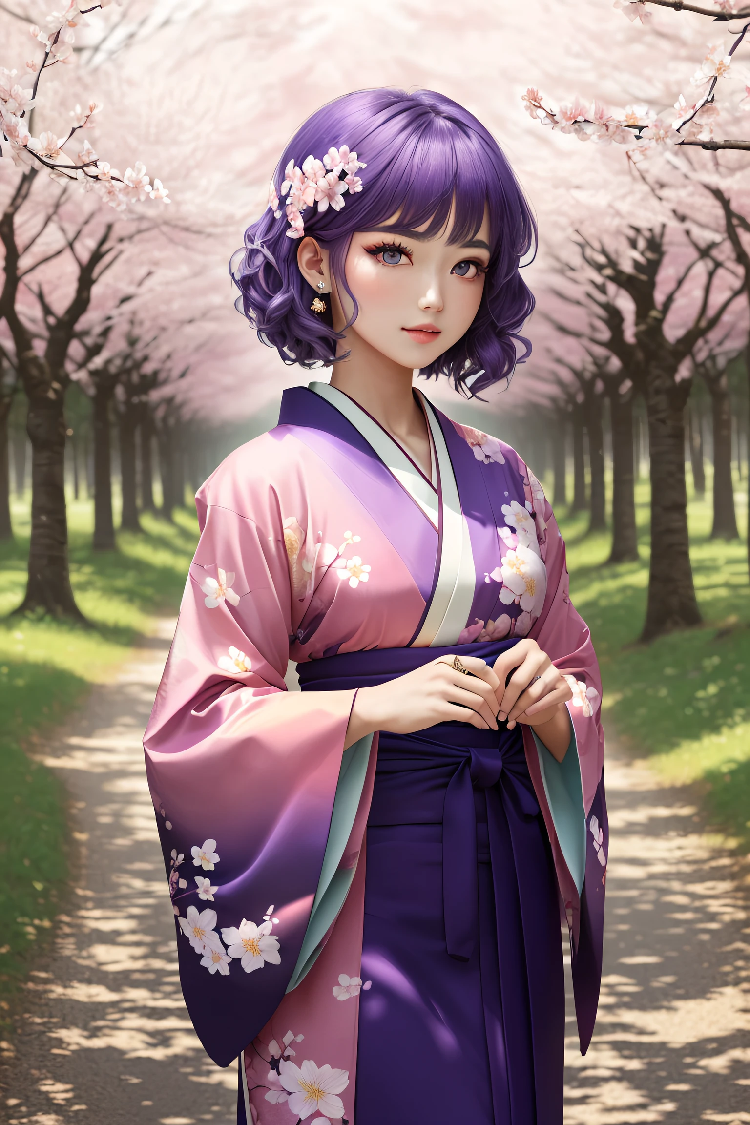 cute and pretty girl with purple hair, light pink eyes, and a flower kimono in a forest of cherry blossom trees, UHD, HDR, 8K, (Masterpiece:1.5)