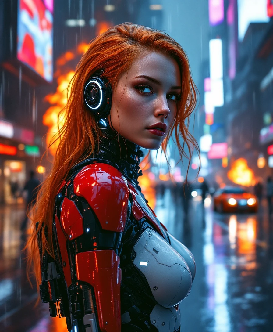 A beautiful masterpiece (8K) full-body portrait of a 25-year-old with vivid colors of red, cobalt, white, and yellow highlights in her hair. She is a cyborg. Her helmet is has different levels missing on her left side. Her armor is multi-colored with Red, black, white, cobalt and red. Her armor has tube lighting bright white. The colors of her legs and feet are mismatched because of her replacement. She is slightly crouched, on the prowl as if she is hunting someone. She is holding a laser pistol in her right hand. It match as her armor. It is dark of night pouring down rain in a dystopian, futuristic city with video boards and neon lights on the buildings. Behind her there are explosions of cars and buildings. There are other cars flipped over in the street on fire. People are running for their lives in the background. ultra high detail, extreme details.