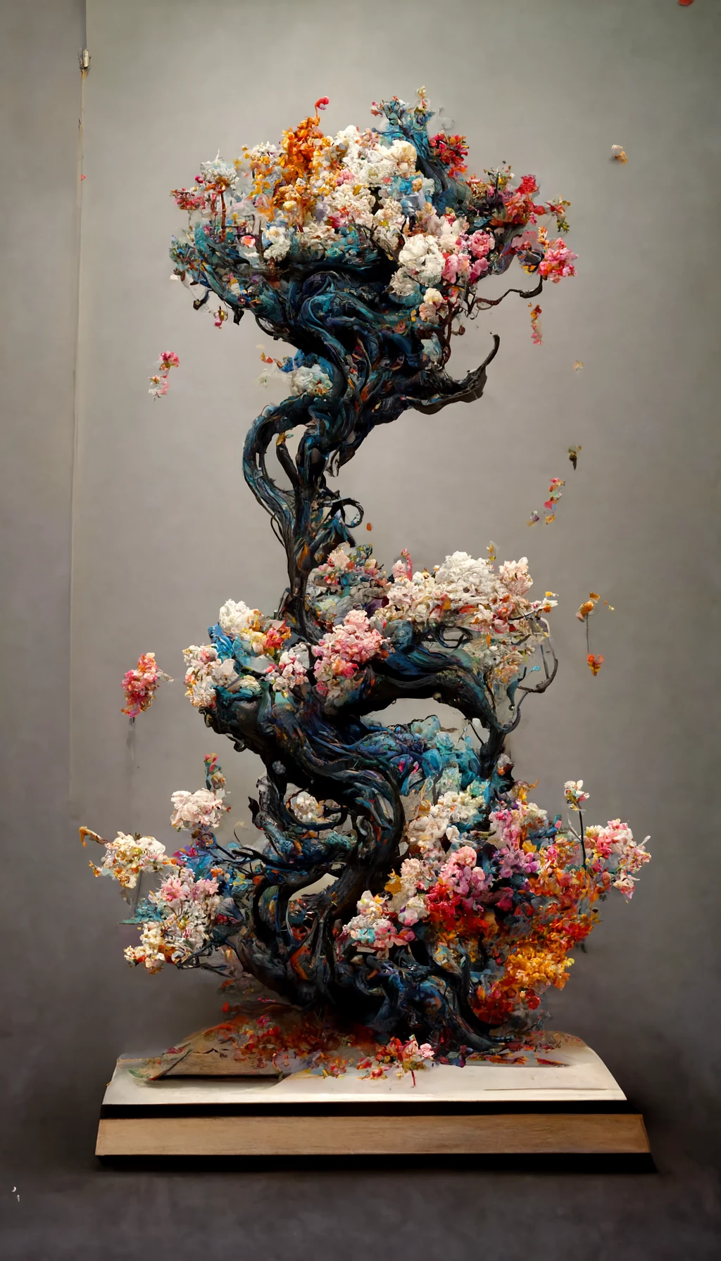 Photography of a dissolving landscape, Ninja+Bookshelf+Pencils sculpture with intricated flowers, trees, exploding and dispersing all around to create a painting. intricated, James Jean, Arnold render, exquisite details, 8k, photorealistic --ar 9:16 --quality 2