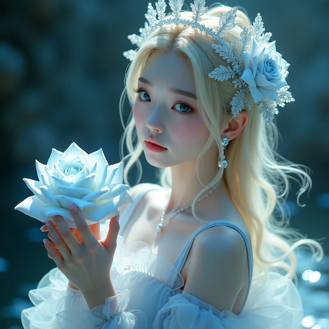 masterpiece, best quality, (Anime:1.4) , silver enchantress, white rose fairy, royal, ancient beauty, high-definition, high-end fashion, ambiguous atmosphere, woman, blonde hair, blue rose, luminous, dreamlike, crystals, white, beige, cute, dreamy, chinapunk, romantic, cinematic lighting, chiaroscuro, medium shot, hyperrealism, Hollywood style, detailed expression, rich details, 1950s comic book style, storytelling, contrast, characteristic linework, animated GIFs, hyperbolic photorealism, blue, silver, heistcore, strip painting, detailed depiction, delicate face, costume details, HD 16K resolution