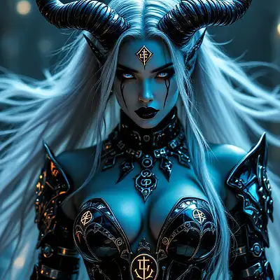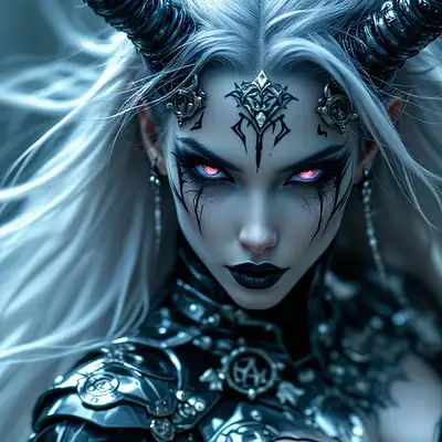 "Full body photo of Sedixia Mörth, alluring dark metal vocalist, ethereal beauty with demonic presence. Dramatic cinematic lighting, photorealistic 8K. Long flowing silver-white hair with obsidian streaks, framing elegant curved horns adorned with silver runes. Wild asymmetrical cascades with intricate warrior braids and metallic ornaments. Elegant pointed ears with multiple silver piercings and delicate chains. Tall, statuesque figure with voluptuous curves. Iridescent blue-green skin with intricate black ritualistic markings flowing from her eyes like dark tears. Mesmerizing violet eyes with feline pupils, radiating ancient power. Sculpted high cheekbones and striking features. Black chrome lipstick with metallic sheen. Generous bust emphasized by provocative neckline. Wearing a futuristic chrome armor ensemble with liquid metal effect - strategic cutouts and plunging neckline with intricate metalwork framing deep cleavage. Reflective chrome plates flowing like mercury across vital areas. Form-fitting armored corset with glowing occult symbols accentuating curves. Thigh-high chrome boots with silver accents. Dramatic cape of shredded silk billowing in unseen wind. Multiple layered silver necklaces bearing mystical runes resting on exposed décolleté. Powerful stance, confronting viewer with intense seductive gaze. Dark atmospheric setting with rolling purple-tinted mist. Looming Gothic cathedral architecture in background with flying buttresses and gargoyles. Hyperdetailed, cinematic composition emphasizing dark glamour and otherworldly beauty. Shot with perfect depth of field, ray-traced lighting emphasizing chrome reflections. "