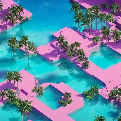 masterpiece, hyperrealistic surrealism, award winning masterpiece with incredible details, epic stunning, infinity pool, a surreal vaporwave liminal space, highly detailed, trending on ArtStation, calming, meditative, teal arches, palm trees, vaporwave, surreal, sharp details, dreamscape, crystal clear water