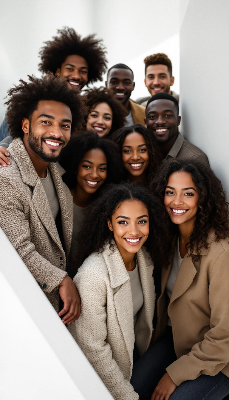 Photo of a 8 ultra realistic white, black and asian friends, 3 white people, 4 black and one asian, in a tight white modern stairway, men and women, in their 30s and 40s, some facing the camera, smiling, fashionable, in the style of hyper-realistic National Geographic photography, expressive, hyperrealism, photorealistic, detailed hair, hyper detail, cinematic lighting --ar 1:2 --stylize 750