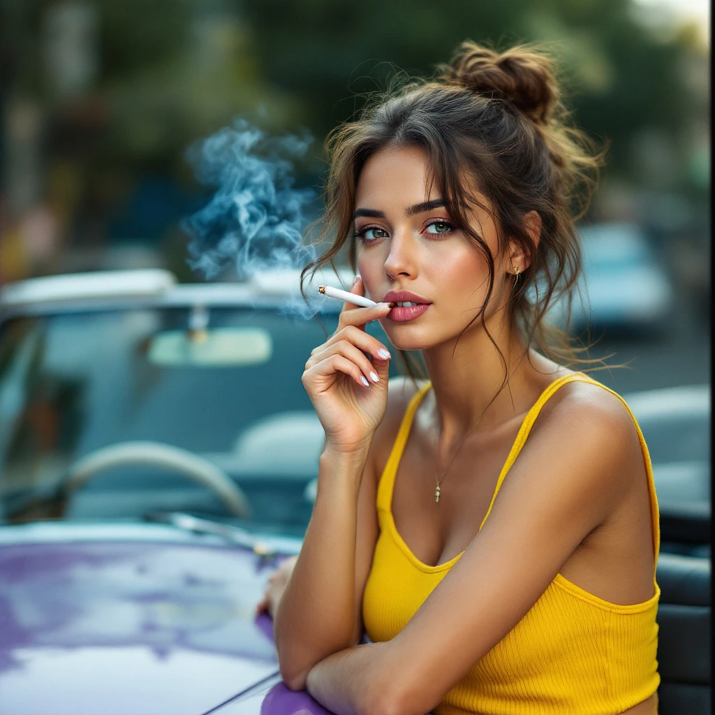 pertty female, She is wearing yellow tank top, The woman is smoking a cigarette, which she holds in her right hand and she is driving a puple Convertible in the street.
