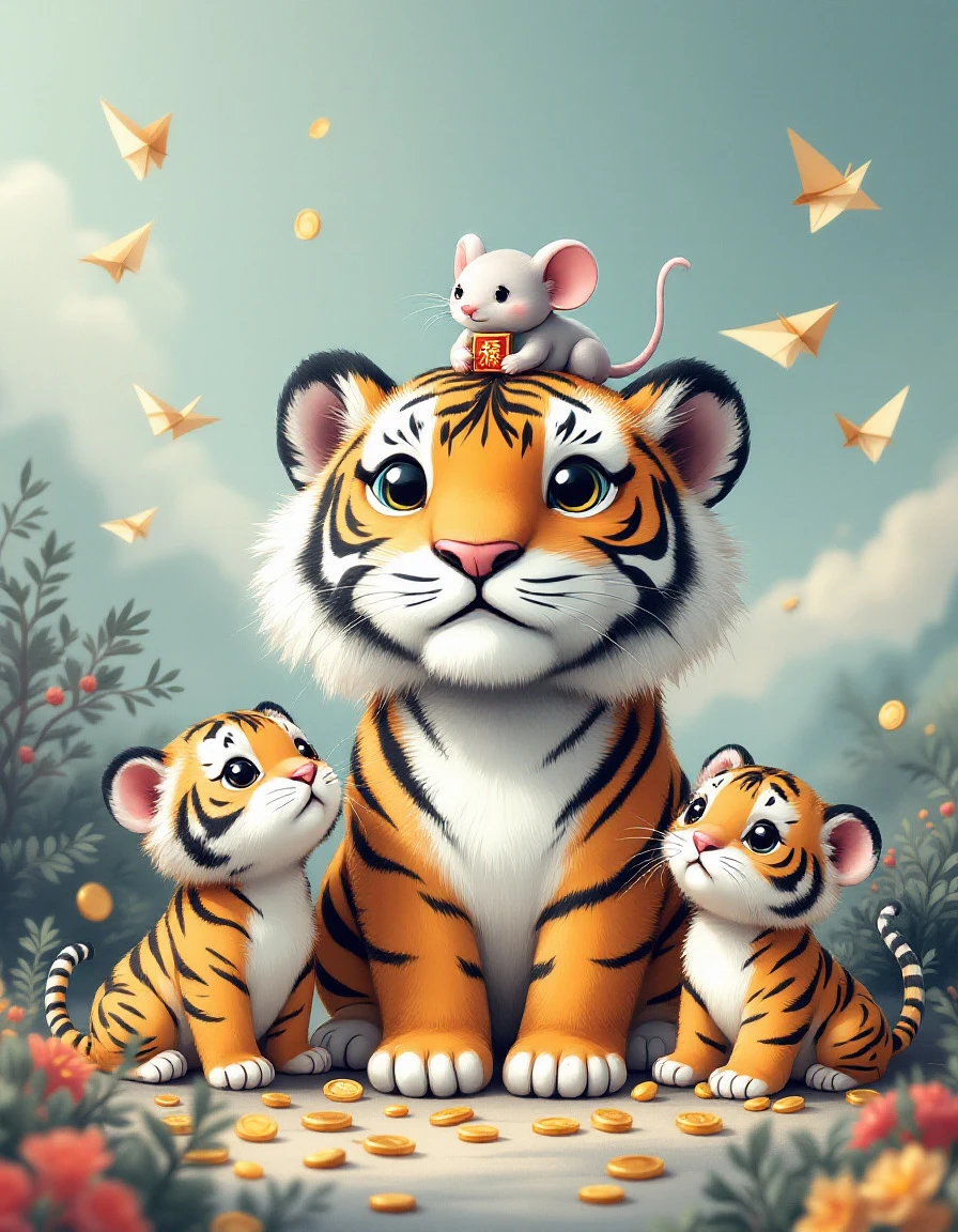 The main body should be kawaii art style, a tiger and two tiger cubs, and a oversized mouse , with a mouse on the tiger's head, the mouse holding a talisman, There are no details, rough, flat, paper airplanes in the background, scattered copper coins and gold beans in the background,
