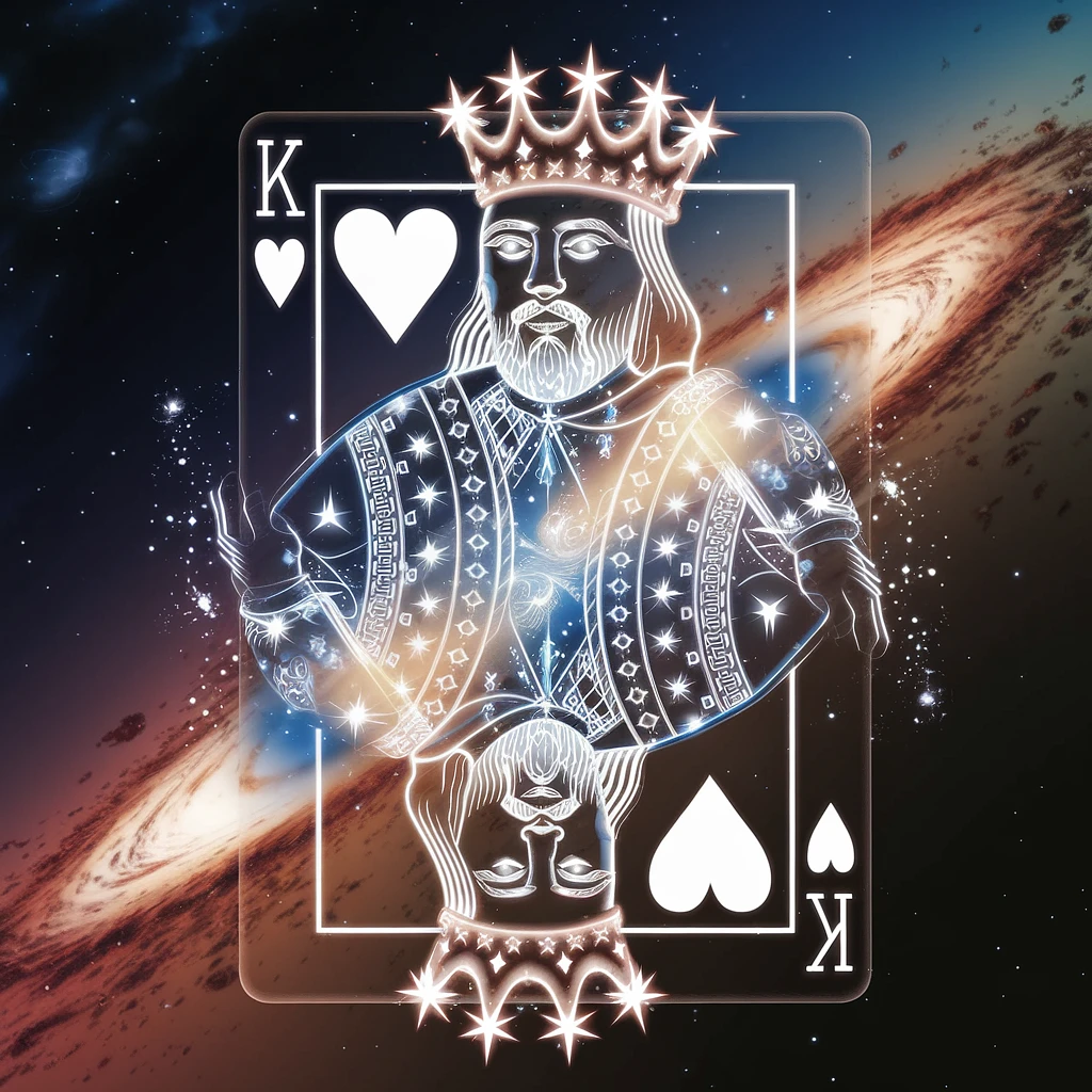 The King of Hearts card transforms into a 3D hologram that appears to be made of cosmic energy. As the King emerges, stars and galaxies swirl around him, creating a sense of traveling through the universe. The King's attire is adorned with celestial patterns, and his crown is a glowing star cluster. The hologram floats in front of you, with the background, shifting through different cosmic scenes, from nebulae to black holes. Atmosphere: Perfect for space-themed events, science fiction conventions, or futuristic tech expos.