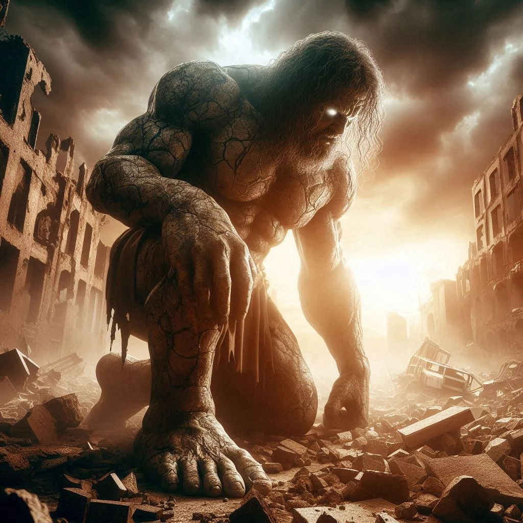Goliath, the biblical giant, emaciated and skeletal from famine, towering over shattered buildings and crumbled ruins, sunken eyes, cracked skin, kneeling in despair, dramatic cinematic lighting, ultra high resolution