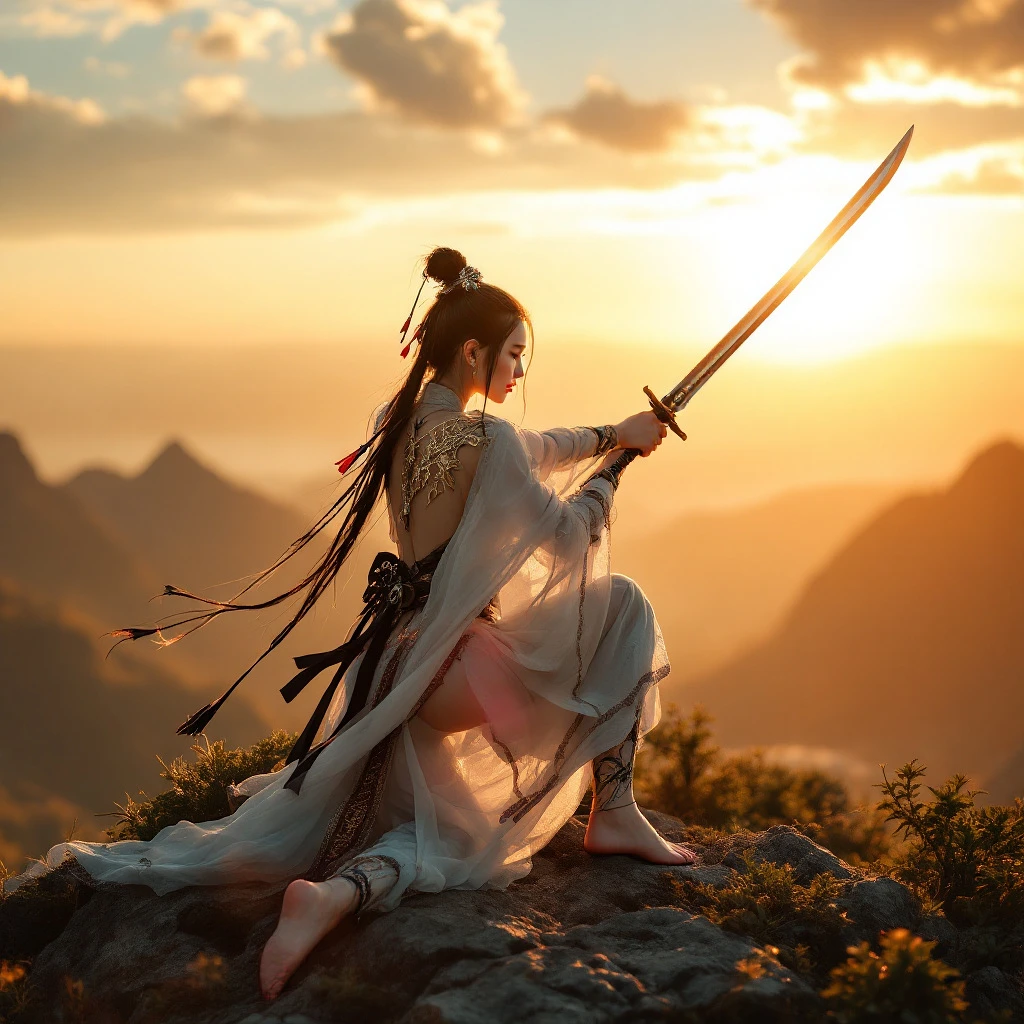 At sunset, during golden hours, closeup photo of a Chinese warrior woman in plastic pose with sword, on top of a mountain, barefoot