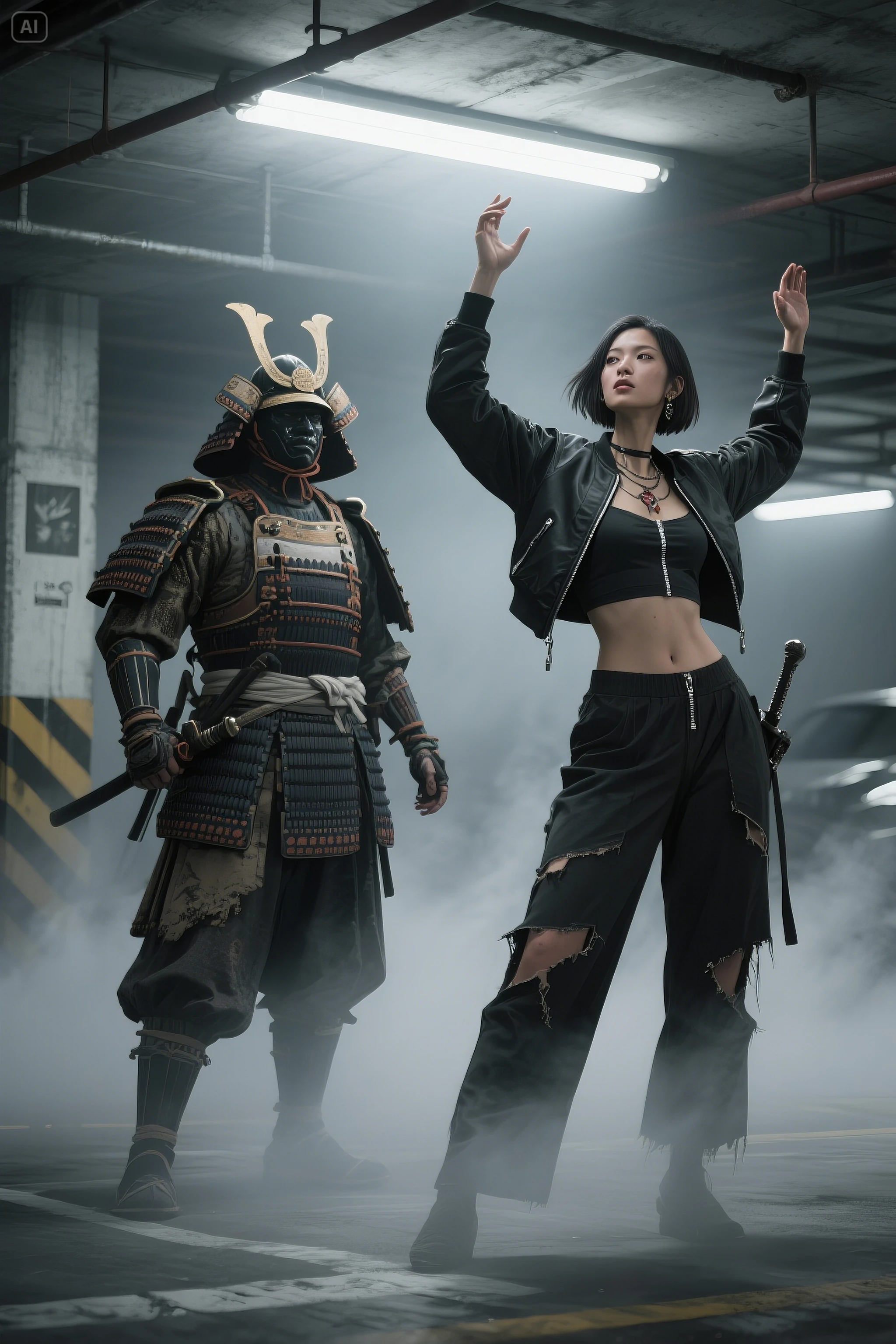 A 12th-century samurai, rendered in Yoji Shinkawa’s ink-washed style with hyperrealistic depth. Volumetric light cuts through fog, Unreal Engine precision, 8K photorealism. Beside them, a Comanche-Yao opera singer (24) exudes poised defiance—slim waist, sun-kissed skin, short bob. She wears brutalist high fashion: zippered jacket, raw-panel trousers, arms raised mid-motion. Stark parking garage backdrop, LaChapelle-esque industrial bulbs. Ultra-detailed, cinematic chiaroscuro.