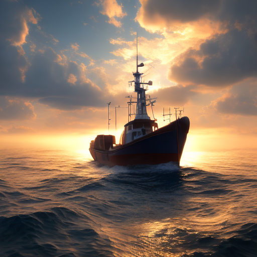 Photo of a ultra realistic sunset with a fishing boat, dramatic light, pale sunrise, cinematic lighting, battered, low angle, trending on artstation, 4k, hyper realistic, focused, extreme details, unreal engine 5, cinematic, masterpiece, art by studio ghibli, intricate artwork by john william turner