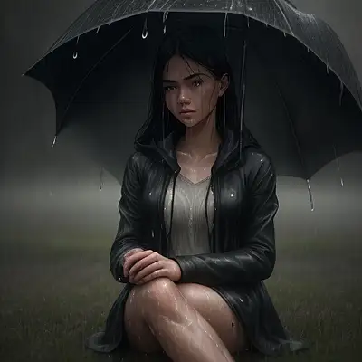 a young woman under (rain:1. 5) on knee in the (wet high grass:1. 5) , (wet face:1. 5) , rainy drops, infinite solitude, dusty atmosphere, loneliness, ray tracing, elegant, intricate, very inspirational, stunning, highly detailed, complex, sharp focus, great composition, cinematic, modern fine classic, volumetric lighting,
