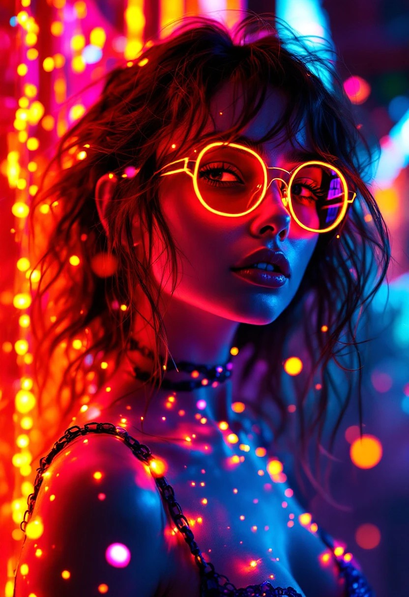 a full body bio limerent woman looking at viewer, Futuristic retro vaporwave, neon woman with long messy wavy hair, wears orange sunglasses, lights densely packed, mimicking the contours and features of a woman's body, bio-luminescent, translucent, cinematic, Film light, surreal hallucinatory intricately detailed, fairy lights, captures viewers with beauty and mesmerism, Hyper detailed, Hyper realistic, masterpiece, atmospheric, High resolution, Vibrant, CLEAR CRIMSON/AMBER/Cyan/purple, light particles, colorful, backlit, cyberpunk. The whole composition should feel vibrant, chaotic, and energetic, perfect for a t-shirt or poster with a neo-vintage comic and psychedelic urban aesthetic. ((best quality master piece. deep lines, heavy strokes,) ) Her expressive, charming eyes and soft, delicate facial features arouse admiration, creating a welcoming and adorable presence. The epic scene with lens glow lighting in a modern futuristic grand setting depicts an intricate with volumetric lighting. (highest quality face) , (highest quality clothes) , (best shadow) high-resolution photography, ultra-realistic --ar 1:2 --stylize 750 --v 6. 1