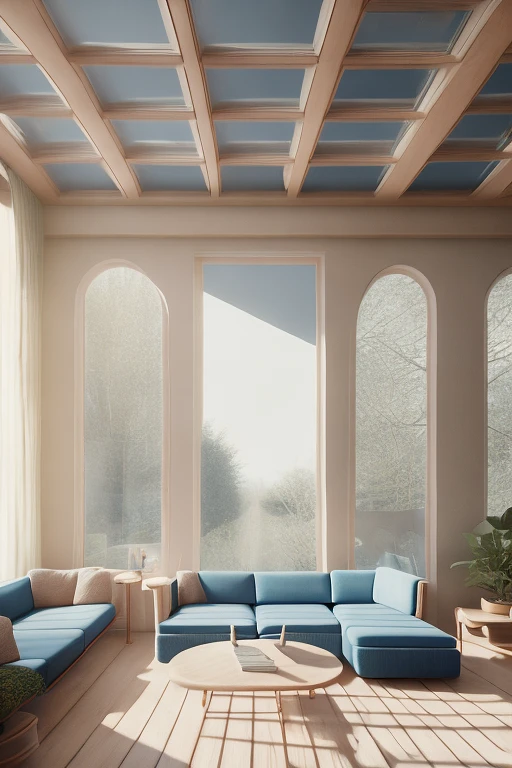 High resolution photography interior design, dreamy sunken living room conversation pit, wooden floor, small windows opening onto the garden, bauhaus furniture and decoration, high ceiling, beige blue salmon pastel palette, interior design magazine, cozy atmosphere; 8k, intricate detail, photorealistic, realistic light, wide angle, kinkfolk photography, A+D architecture