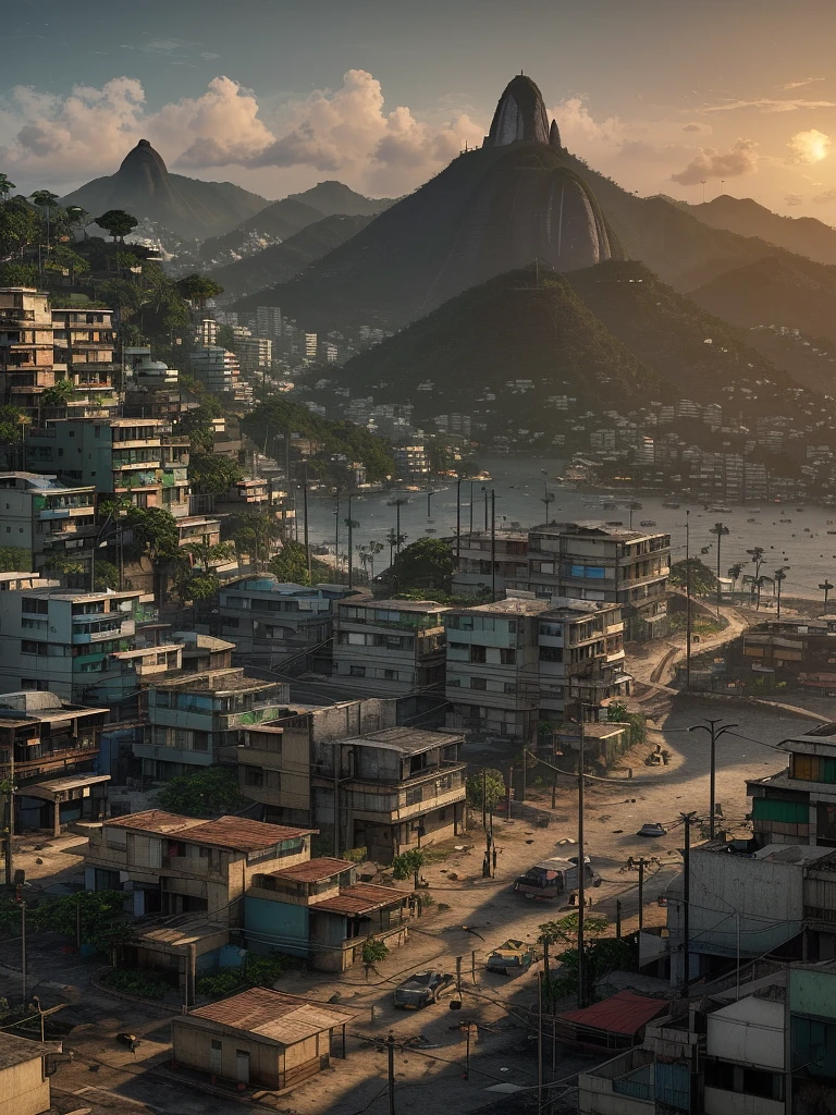 Photo of a ultra realistic Favela of Rio de Janeiro, dramatic light, pale sunrise, cinematic lighting, battered, low angle, trending on artstation, 4k, hyper realistic, focused, extreme details, unreal engine 5, cinematic, masterpiece, art by studio ghibli, intricate artwork by john william turner