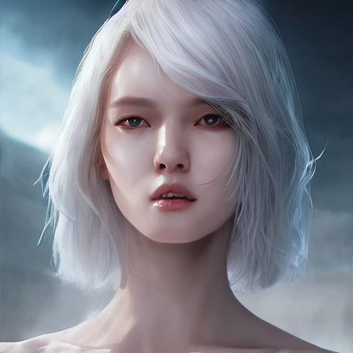 mdjrny-v4 style, full body, medium length white hair, a young South Korean girl wearing pink lingerie, proportional body, a highly detailed face by Greg Rutkowski and Magali Villeneuve, beautiful eyes, toned body, cinematic lighting, depth of field, photography