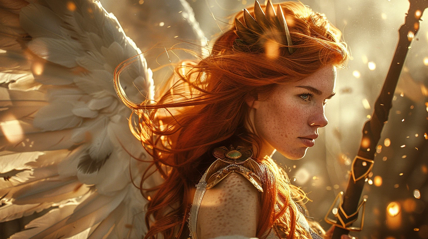 Portrait photography, Ultra realistic photography of an Angelic Female Warrior, style of Annie Leibovitz, muscular and slim feminine body, slim fit, mystical nordic surroundings, Most beautiful woman, fire red long hair, she has white big wings on her back, wearing a golden Thor like helmet, wears, long golden high heel boots that cover her knees, long white slim fit dress with golden indices, she holds a long golden spear that is glowing, insane details, intricate, details, vibrant colours, sharp focus, bokeh, Hasselblad X1D, f 1. 8, --ar 16:9 --cref https://s. mj. run/uP_26dwxwRo --cw 0 --stylize 250