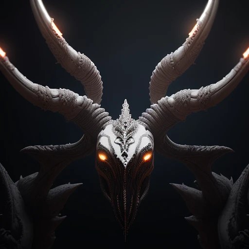symmetrical fractal spikes, baphomet, xenomorph, ornate, cinematic lighting, white lights, dark, extremely fine detail, 8k, high octane render