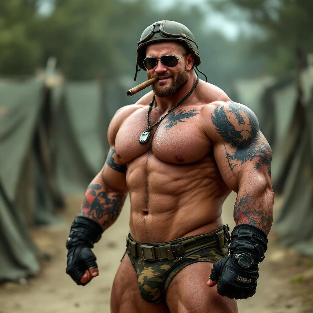 Chris Redfield. Full body image, looking at us, shirtless, muscular abs, lots of tattoos, eagle chest tattoo, dog tags, aviator sunglasses, big cigar in mouth, black fingerless gloves, big long penis bulge in camouflage thong underwear, army helmet, big feet in black combat boots, standing on dirt road with army green tents, flexing one bicep, grinning