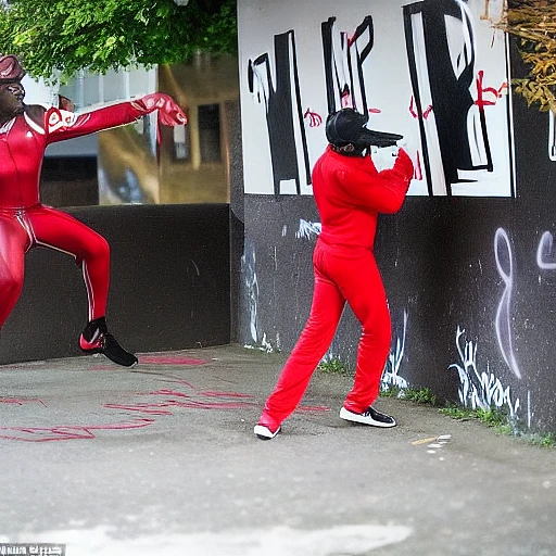 A black man in a red helmet and dark red lycra outfit, doing graffiti at night is in a fight with a whiteman in a white lycra and black helmet with spikes in the rain
