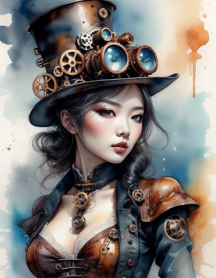 psychedelic, steampunk, sumi-e, traditional chinese ink art, rich colors, vignette, moody, dark, epic, gorgeous, magical, glowing , luminism , bioluminescence, trending on artstation, watercolour, bright colors, a beautiful goddess, (in the style of Luis Royo:0.3, Victoria Frances:0.4, Keith Parkinson:0.3) , Beautiful, stunning, windy, slender body, toned body, perfect face, slim athletic body, (perky small breasts:0. 75) , (cold attitude, eyeshadow, eyeliner:1. 6)