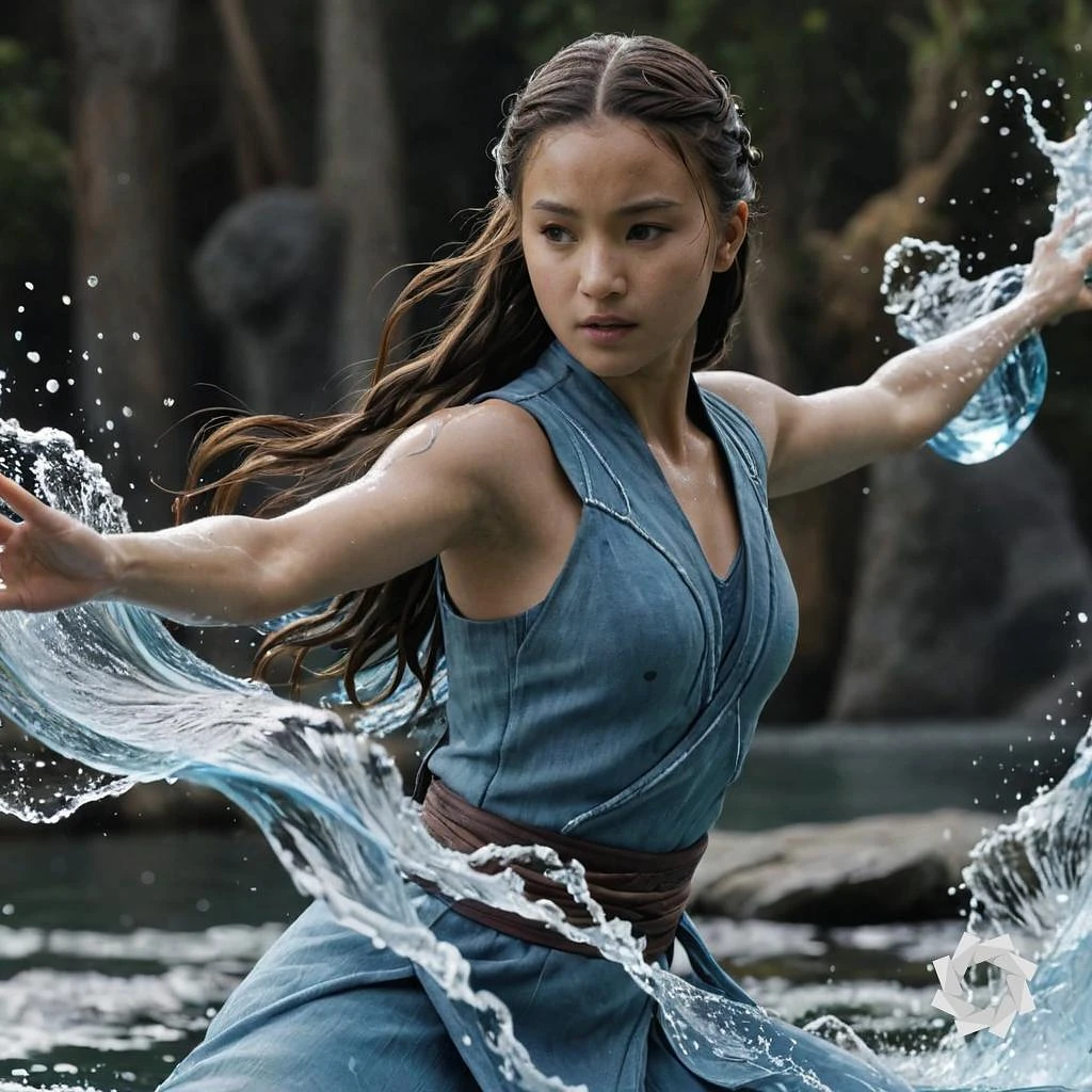 Generate a realistic portrayal of Katara skillfully practicing waterbending, capturing the fluidity and power of her movements with precision. Ultra detailed, hd, 8k