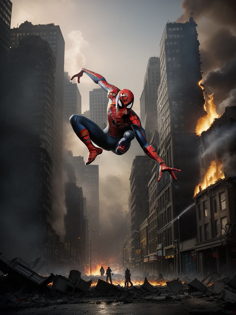 Realism, toys photography, toys, Spider-Man, marvel, full body, full, background of destroyed city on fire, scary, town, sharp focus, backlight, focus the light on the face, natural light, light from the frontdetail, high quality, hd, 4k, 8k, photography, leica camera, lens f1. 2, Hasselblad x2d, epic, movies