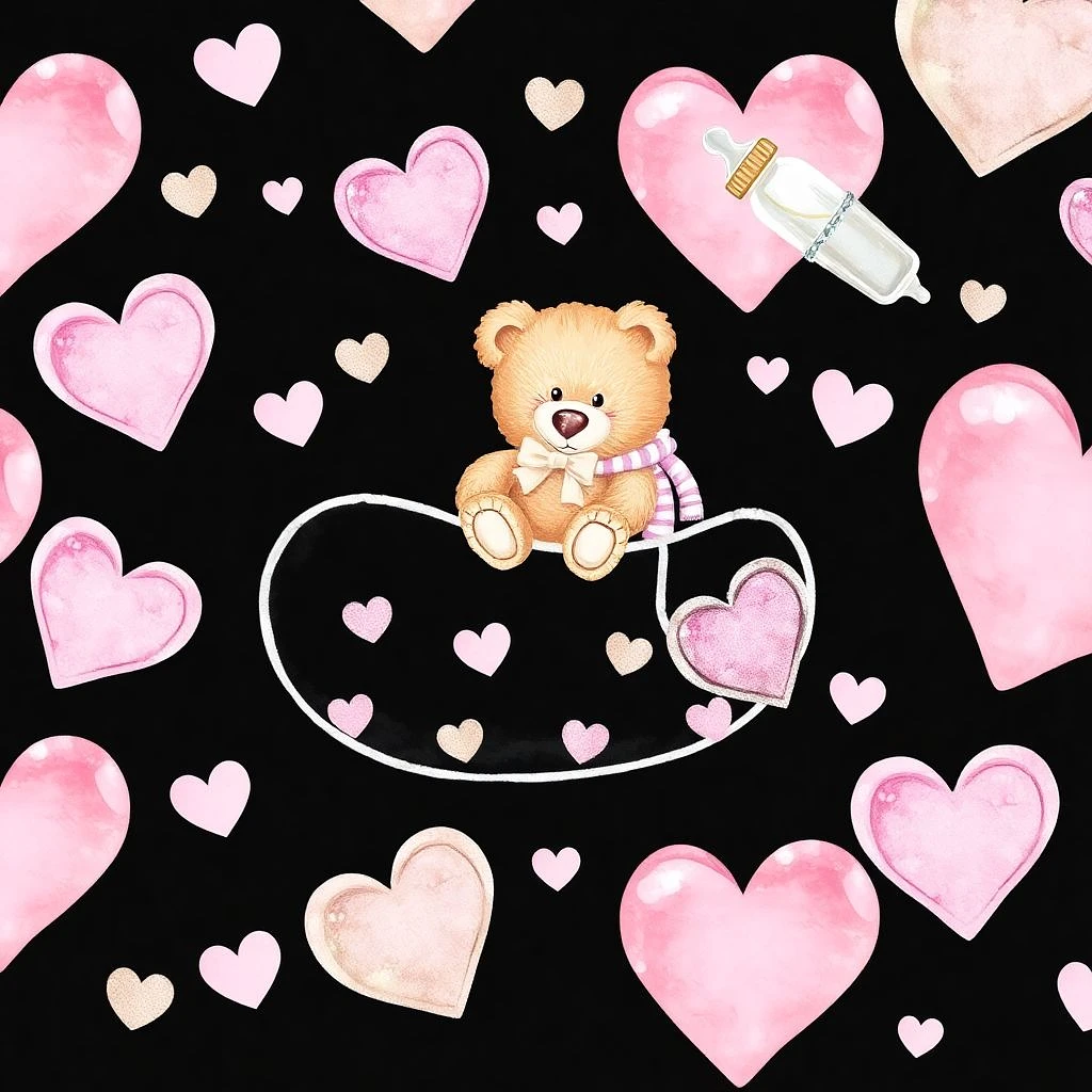 watercolor style chic bling glamorus fabulous cute baby raddle, pacifier, teddy bear, baby bottle. safety pin, bibb, pastel black metalic valentines heart patterns