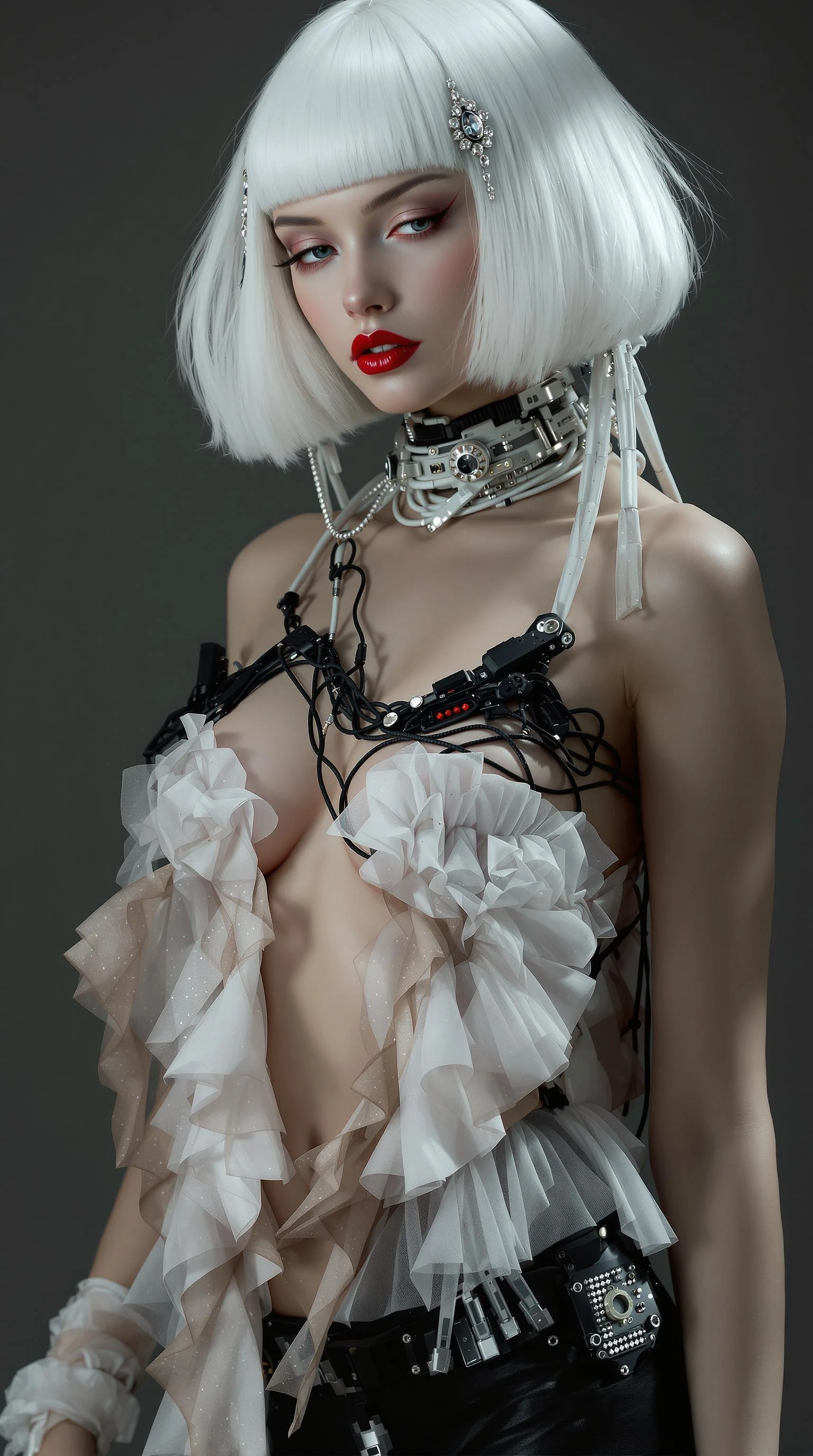 A royal beautiful futuristic cyborg woman with white bob hair and red lips, flat chest, wearing black leggings, open top with subtle tulle with frills (and with subtle electronic pieces with shiny Swarovski incrustations) , dark grey backdrop, fashion editorial photography --chaos 10 --ar 3:4 --style raw --stylize 200--