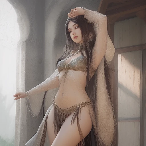 A beautiful Asian woman with long hip length raven hair stands posed elegantly, in a medieval middle eastern village her sultry smile illuminated by warm lighting. She wears a black crystal jeweled belly dancing attire. One hand rests on her hip, the other on her thigh, as she poses confidently. The sun shines high overhead creating a dreamy, ethereal atmosphere. The scene is framed with a shallow depth of field, emphasizing her expression and the intricate details of her attire. The lighting is moody and atmospheric, with a soft, diffused key light from the front and a subtle rim light from behind, casting a gentle glow on her skin. The background trees are covered in a medieval middle eastern city adding to the serene, otherworldly mood. Film grain and a slightly desaturated color grading enhance the cinematic quality.