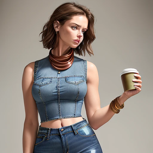 A photorealistic image of a woman in a stylish denim ensemble. She wears a sleeveless, form-fitting blue denim top, tucked into high-waisted jeans, cinched at the waist to emphasize her silhouette. The woman is holding a white coffee cup in her right hand, her left adorned with a wide brown leather bracelet, coiling multiple times around her wrist. She's also holding a delicately folded white cloth or napkin. Her hair is styled in a neat, low ponytail, and she sports a natural makeup look featuring defined brows and a subtle lip color. The background has a soft, textured gradient of blue and beige, complementing her attire and adding depth to the composition.