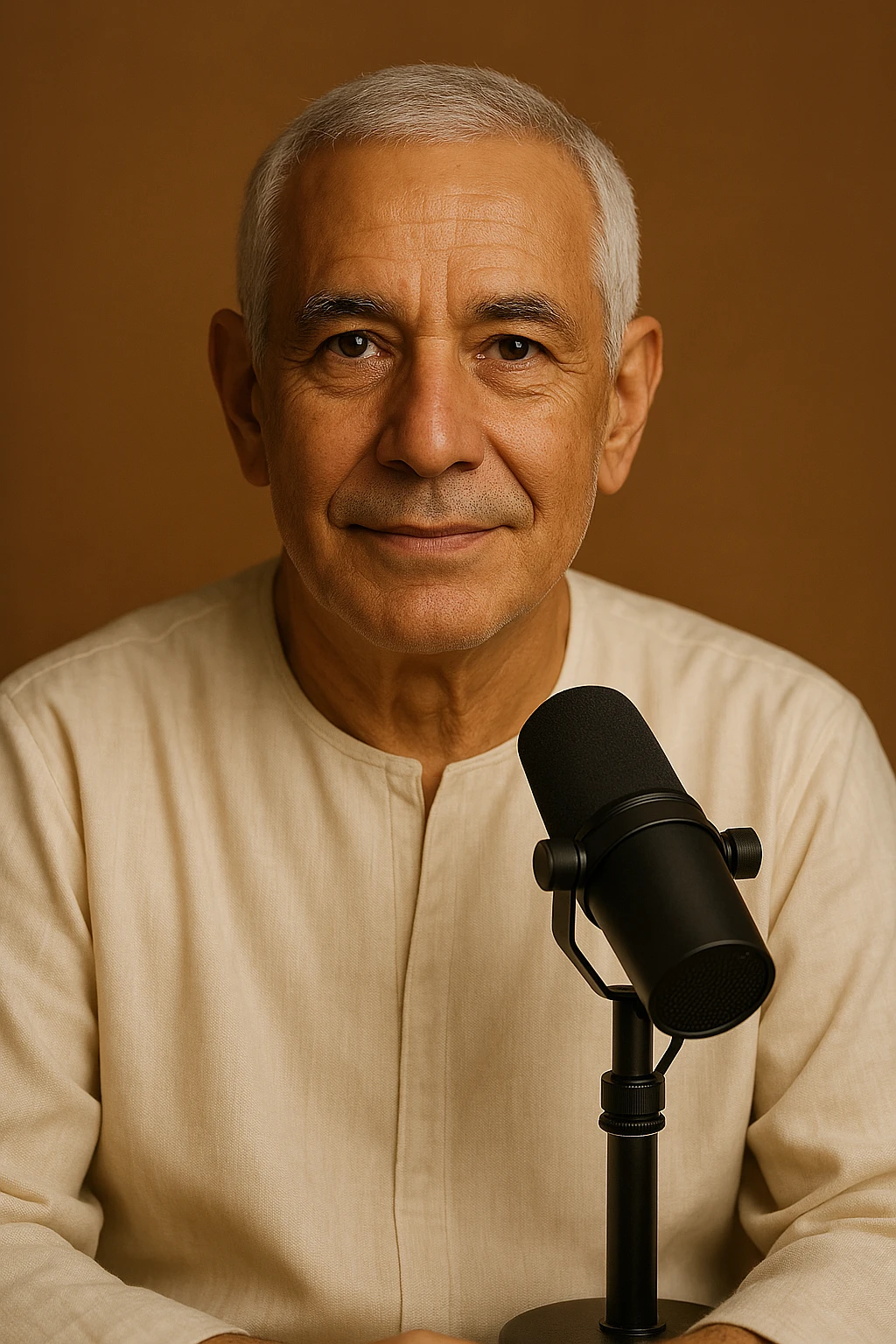 Ultra-high-resolution, hyper-realistic, professional color photographic portrait of a distinguished, older male podcast host. His presence is commanding yet gentle, exuding profound wisdom, a calm demeanor, and an approachable, grounded personality. The focus is a tightly cropped head-and-shoulders shot, or a wider shot showing him seated in his studio. Overall Photographic Style: A definitive, timeless, and authentic portrait capturing the essence of a wise elder. The image exhibits extreme clarity, pixel-perfect sharpness, and intricate micro-detail across all elements. It appears as if captured by a master portrait photographer using a cutting-edge large-format digital camera (e.g., Phase One XF IQ4 150MP, Hasselblad H6D-400c MS) with an uncompromised, razor-sharp prime portrait lens (e.g., Schneider Kreuznach 110mm LS f/2.8, Zeiss Otus 100mm f/1.4) . The portrayal exudes profound intellect, unwavering authority, and a calm, subtly engaging, and dignified presence, reminiscent of a respected storyteller. Lighting: Impeccable, soft, and perfectly diffused natural studio lighting, simulating warm, golden hour light filtering through a window or a large, enveloping softbox. The illumination meticulously sculpts the contours of his face, creating subtle, delicate, yet precisely defined shadows that articulate his strong, defined jawline, the distinct, almost crescent-shaped lines under his eyes, and the gentle indentation below his lower lip. Bright, natural, and balanced highlights gleam distinctly on his high forehead, the bridge of his nose, and the upper curve of his cheekbones. His eyes feature crisp, perfectly round and bright dual catchlights, imbuing them with intense life, profound wisdom, and a direct, penetrating yet gentle gaze that establishes strong eye contact with the viewer. The illumination is uniform across his face, avoiding any harsh hotspots, blown-out areas, or flat, uninteresting tones, meticulously revealing every individual skin pore, subtle wrinkle, and distinct hair strand detail. Depth of Field: Extremely shallow depth of field (razor-thin focus plane) , producing an exceptionally creamy, artistic, and velvety smooth "bokeh" effect. Focus is critically, microscopically sharp on every minute detail of the subject's eyes (visible iris patterns, pupil definition, fine capillaries) , the hyper-realistic texture of his skin (individual pores, subtle lines around eyes and forehead, natural skin sheen) , and the intricate fabric texture of his galabeya. The background is an absolute, undifferentiated, smooth blur of uniform muted earth tones (specifically, a warm terracotta, muted olive green, or deep sandy beige) , entirely devoid of any distracting features, textures, patterns, or tonal variations, ensuring zero distraction and maximizing the visual impact of the subject's face. Color Palette: An exquisitely natural, rich, and earth-toned color palette, optimized for true-to-life representation of warm desert and rural hues. Skin tones are healthy, with subtle underlying reddish-brown warmth, displaying nuanced color shifts and natural subsurface scattering that mimic real human complexion (e.g., slightly richer tones on cheeks and nose, paler on forehead) . Hair is a brilliant, unblemished salt-and-pepper grey, or uniformly light grey, with no dark undertones or visible roots. Clothing consists of classic, light, and solid tones: a traditional Egyptian galabeya in a pristine, crisp cream, off-white, or very light beige. Subtle, natural highlights on the fabric. Subject Details: * Age: Visibly in his late 60s to mid-70s, appearing robust, distinguished, and embodying a lifetime of experience. * Expression: A highly specific and complex expression: a direct, unwavering, and intensely intelligent gaze fixed straight into the camera. His eyes convey a sharp, discerning intellect and profound wisdom. Crucially, a subtle, engaging, and genuinely pleasant "soft smile" plays on his lips, characterized by a slight, gentle upward curve at the corners of his mouth. This expression is one of calm confidence, approachable warmth, and deep insight, precisely capturing his well-known persona. No overt wide smile, no sternness, only this unique, amiable blend. * Face Shape: A strong, broad oval face, with a pronounced, high, and somewhat broad forehead that exhibits very subtle, natural horizontal lines (forehead furrows) that convey wisdom, not age. Strong, firm jawline and well-defined, subtly rounded cheekbones. The face appears full and substantial, conveying a sense of grounded stability and deep contemplation. * Hair: * Color: Uniformly brilliant, luminous salt-and-pepper grey or light grey, with no dark or yellowing tones. * Style: Very short, neatly trimmed, and smoothly combed, showcasing a classic, timeless look. * Eyes: * Color: Striking, crystal-clear, and soft dark brown. The irises must show intricate, fine detail, with a clear limbal ring. * Shape: Almond-shaped, wide open, conveying a remarkably keen, insightful, and direct look. The area around the eyes should show very fine, natural aging lines (crow's feet) , but no heavy bags, dark circles, or puffiness. * Eyebrows: Medium density, light grey, perfectly groomed, and follow a natural, slightly arched shape. They are distinct but not overly bushy or thin. * Nose: A prominent, straight, and robust nose, with a slightly broad base and well-defined, symmetrical nostrils. * Mouth and Lips: Medium-full, clean-shaven lips, forming a straight, composed line with the precise, subtle, and genuinely pleasant upward curve at the corners that defines his unique soft smile. The skin around the mouth should be smooth but show natural texture and subtle laugh lines if appropriate. * Chin: A strong, very well-defined, and clean-shaven chin, appearing robust, possibly with a very subtle dimple or cleft. * Distinguishing Features: Impeccably clean-shaven face. The striking contrast between his traditional attire and his distingui