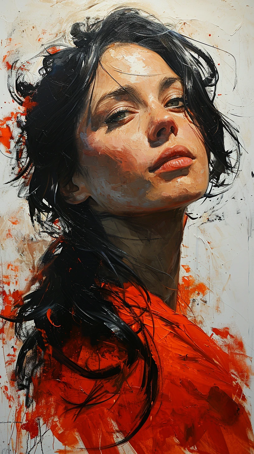 a large painting depicting a woman with long black hair, in the style of david bailey, dark orange and red, mark lague, michael cho, crumpled, bold lithographic, poster art --ar 9:16 --stylize 750 --v 6