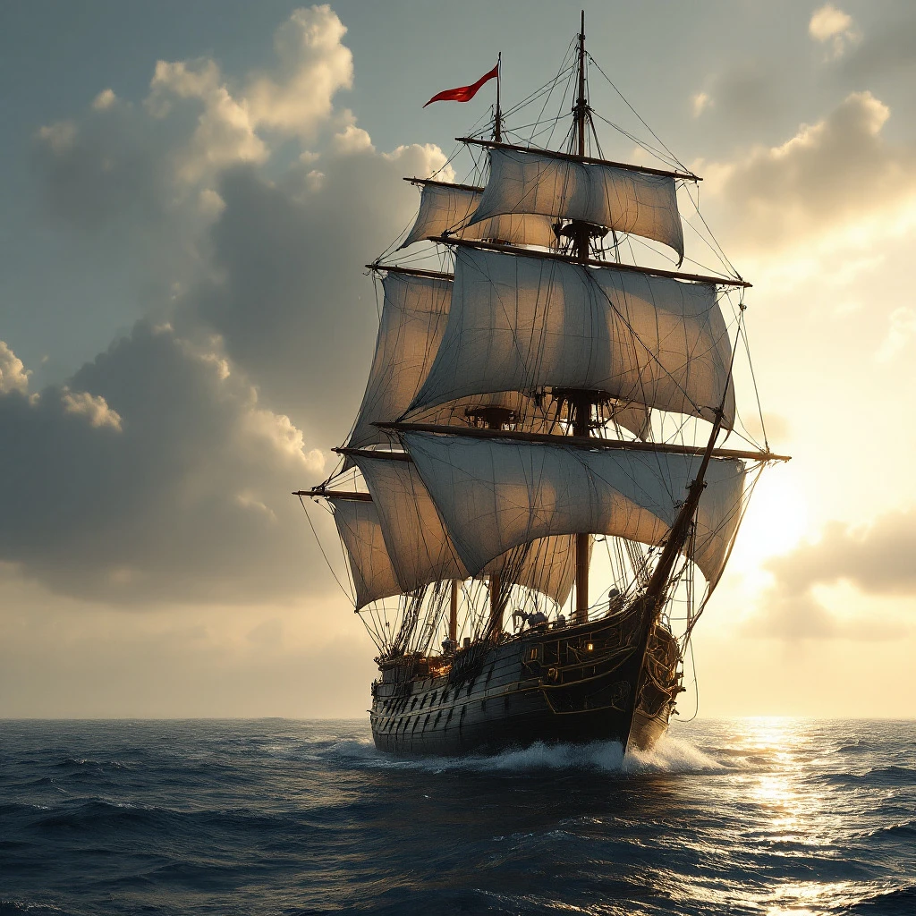 Photo of a ultra realistic sailing ship, dramatic light, pale sunrise, cinematic lighting, battered, low angle, trending on artstation, 4k, hyper realistic, focused, extreme details, unreal engine 5, cinematic, masterpiece, art by studio ghibli, intricate artwork by john william turner