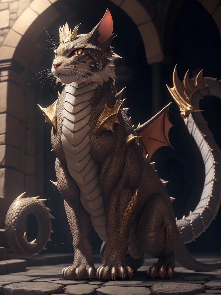 dragon-cat, full body shot, cinematic, light colors, hyper detalic, 8k, light, dragon's dungeon