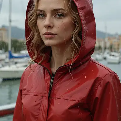 a woman in a red raincoat standing in the rain, a photorealistic painting by Hedi Xandt, featured on cg society, art photography, behance hd, redshift, photo taken with nikon d750